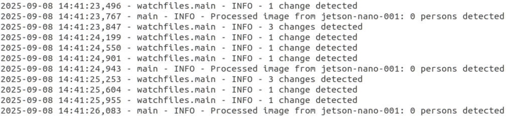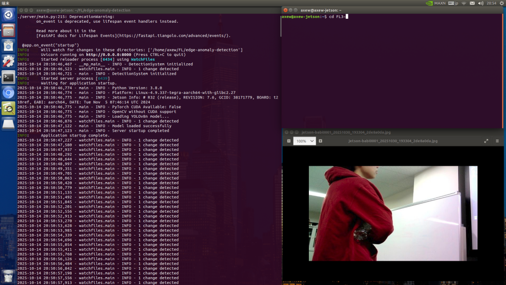 2. プライバシーに配慮したエッジAI検知: 受信した映像はAIモデル(YOLOv8n)で解析され、人物を自動で検知します。小型計算機(NVIDIA Jetson Nano)を使用し、検知結果と画像のみを記録する仕組みを採用することで、個人のプライバシーに最大限配慮しつつ、人手に頼っていた監視業務の自動化・省力化を劇的に推し進めることができます。