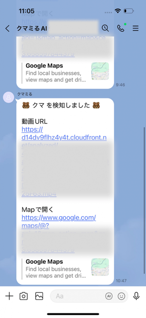 さらに、映像の伝送からAI解析、警報通知までを一貫して確認でき、エンドツーエンドでの連携が有効に機能することが実証された。クマミるAIがクマを検知した際には、登録されたLINEアカウントへ警報が自動送信される仕組みであり、現場での迅速な対応に寄与する。
