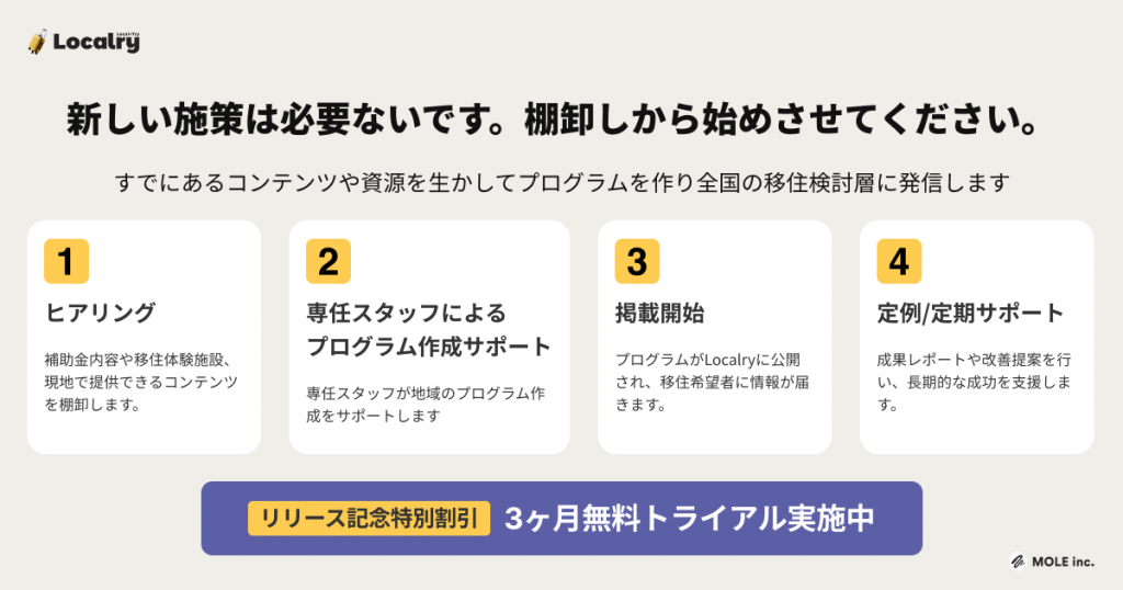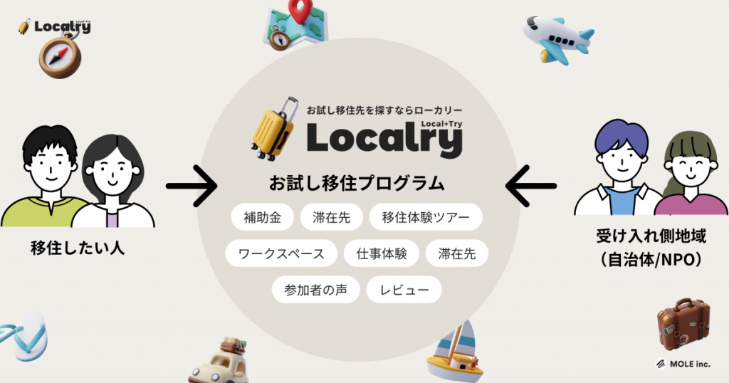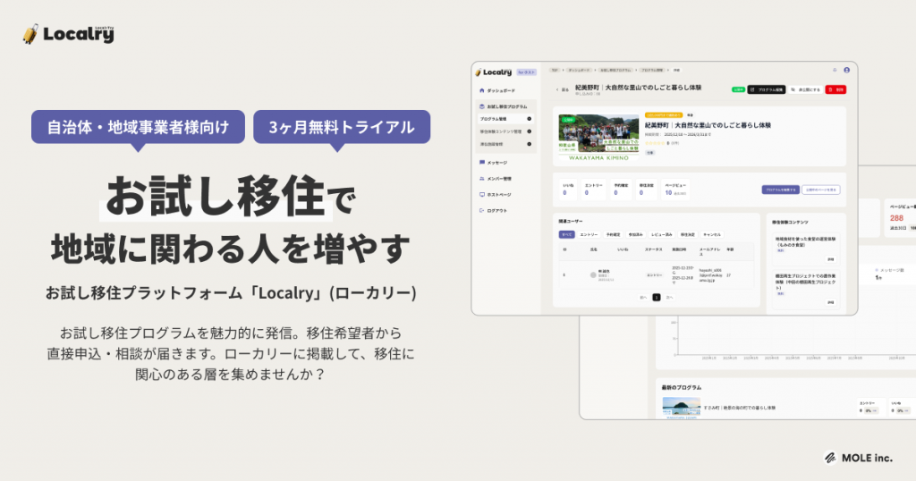 株式会社MOLEは、お試し移住プラットフォーム「Localry(ローカリー)」をリリースし、全国40以上のお試し移住プログラムの掲載を開始した。移住を検討するユーザーに向けた集客を本格的に開始するとともに、自治体向けの無料トライアルも継続して実施している。