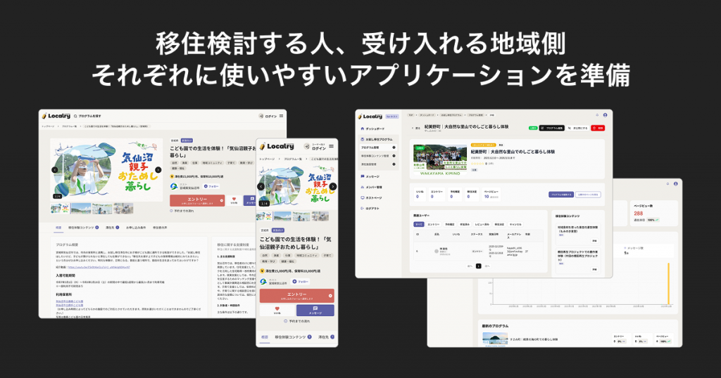 Localryは、全国各地のお試し移住プログラムを一覧で探せるプラットフォームとして開発された。補助金情報、仕事体験・暮らし体験の内容、滞在施設の情報などをまとめて掲載することで、移住検討者が自分に合ったプログラムを簡単に比較・検討できる仕組みを提供している。