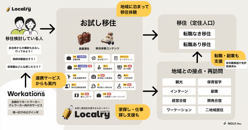 また、ワーケーションプラットフォーム「Workations」との連携により、「働きながら地域を知る」「お試し移住で暮らしを体験する」「本格移住へ進む」という一連の流れを支援する構想も示されている。Localryは、移住前の不安を解消し、地域と人をつなぐ新たな接点としての役割を担っている。